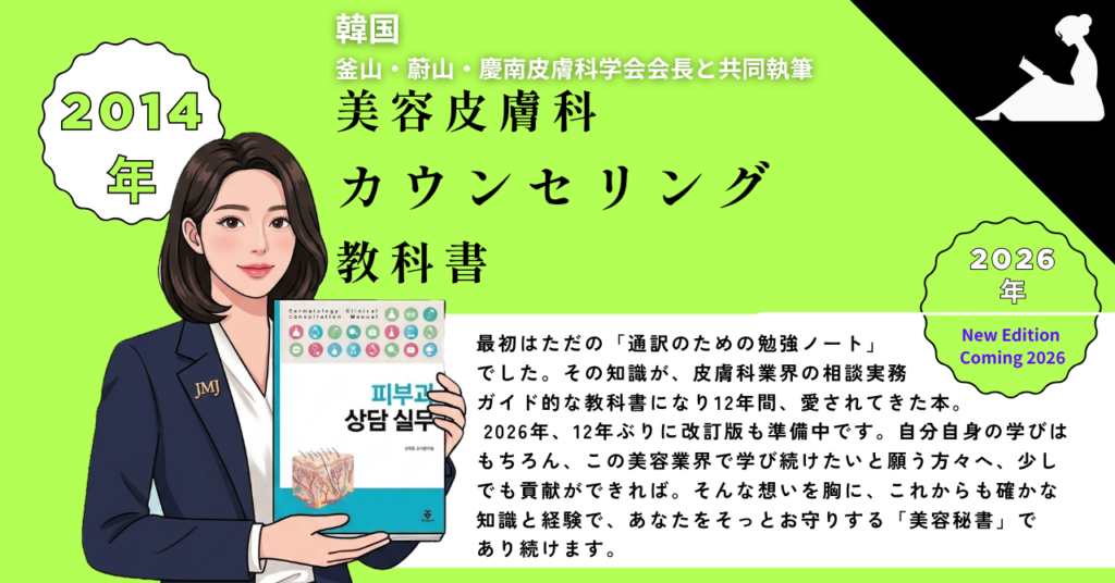 私が2014年に、釜山・蔚山・慶南皮膚科学会会長と共に『皮膚科相談実務(美容皮膚科カウンセリング教科書)』を共同執筆したのも、まさにその想いからでした。16年間の医療現場経験と、教科書にまとめた確かな知識で。