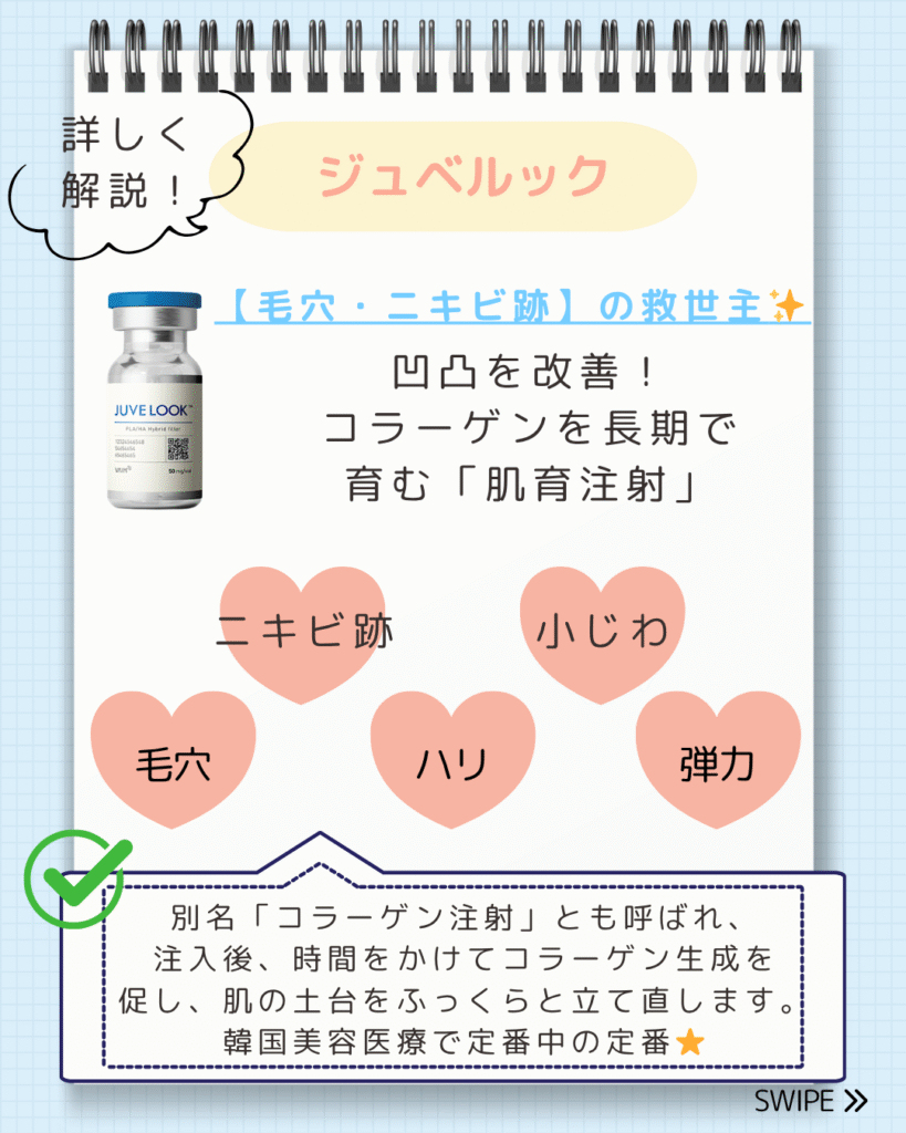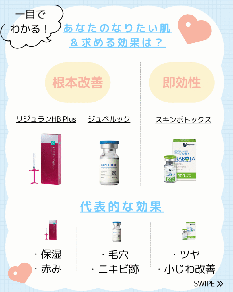 韓国には数多くのスキンブースターがありますが、特に人気と実績が高いのが「リジュラン」と「ジュベルック」です。それぞれの特徴を一言で表すなら…