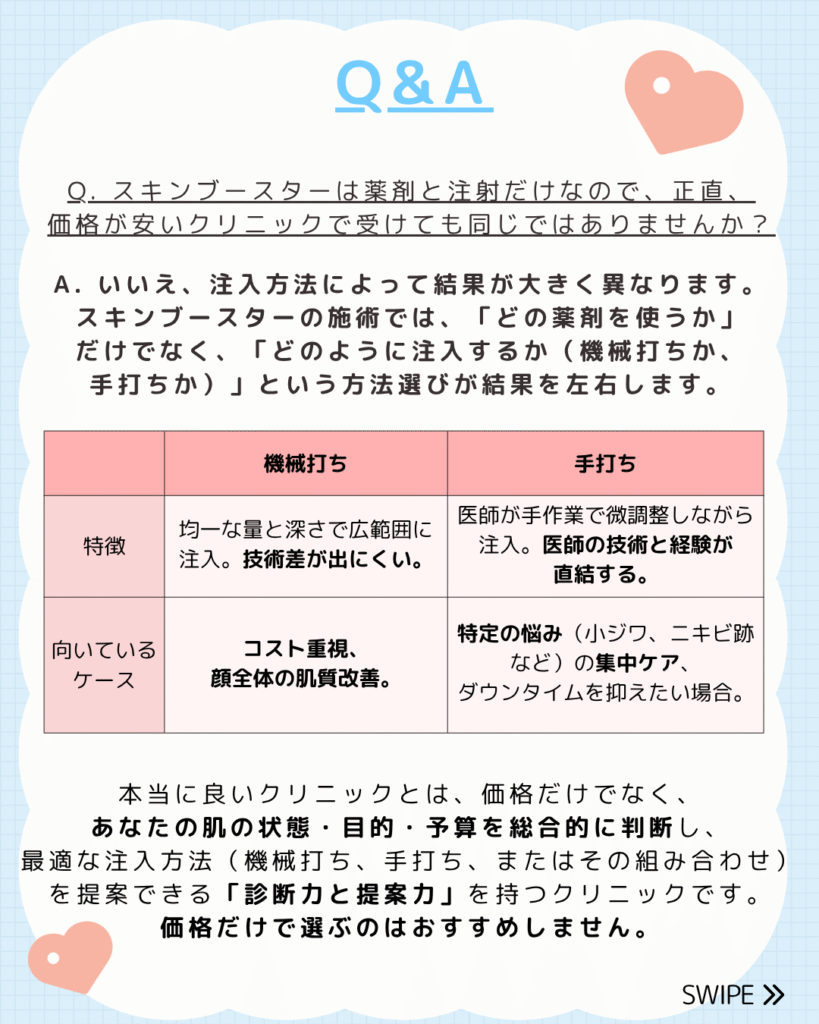 スキンブースターの注入方法には、機械で注入する「機械打ち」と、医師が注射器で直接注入する「手打ち式」があります。