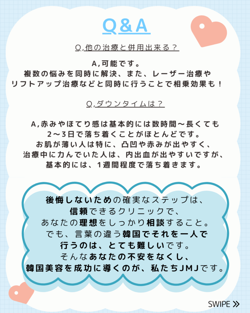 | 術後の注意事項 | ・施術後、1週間は過度な飲酒、サウナやチムジルバン、お風呂での入浴、激しい運動は控えてください。 ・肌がボコボコになるエンボス、あざ、腫れ、軽い痛み、赤みが現れる可能性がありますが、数時間~数日で治まります。 ・施術後は保湿剤をこまめに、外出時には必ず日焼け止めを塗ってください。 ・スクラブ剤やピーリングは1週間は控えてください。 ★まれに、注射針を刺した部位に内出血が起こる場合があります。内出血の対策として術後、アイスパックで冷やすと効果的です。(熱いお風呂やサウナも避ける) |